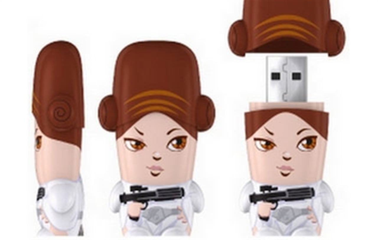 También hay memorias USB con diseños divertidos, como los de la serie de Star Wars con los personajes de la Princesa Leia (foto), Han Solo y Luke Skywalker. Estos se consiguen en popgadget.net.