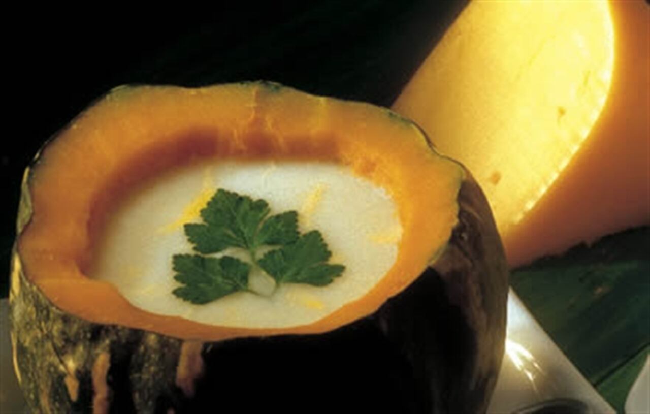 7. Cuando los quesos se hayan derretido, adiciona la crema. No la dejes hervir porque se corta. Sírvela bien caliente entre una auyama partida.