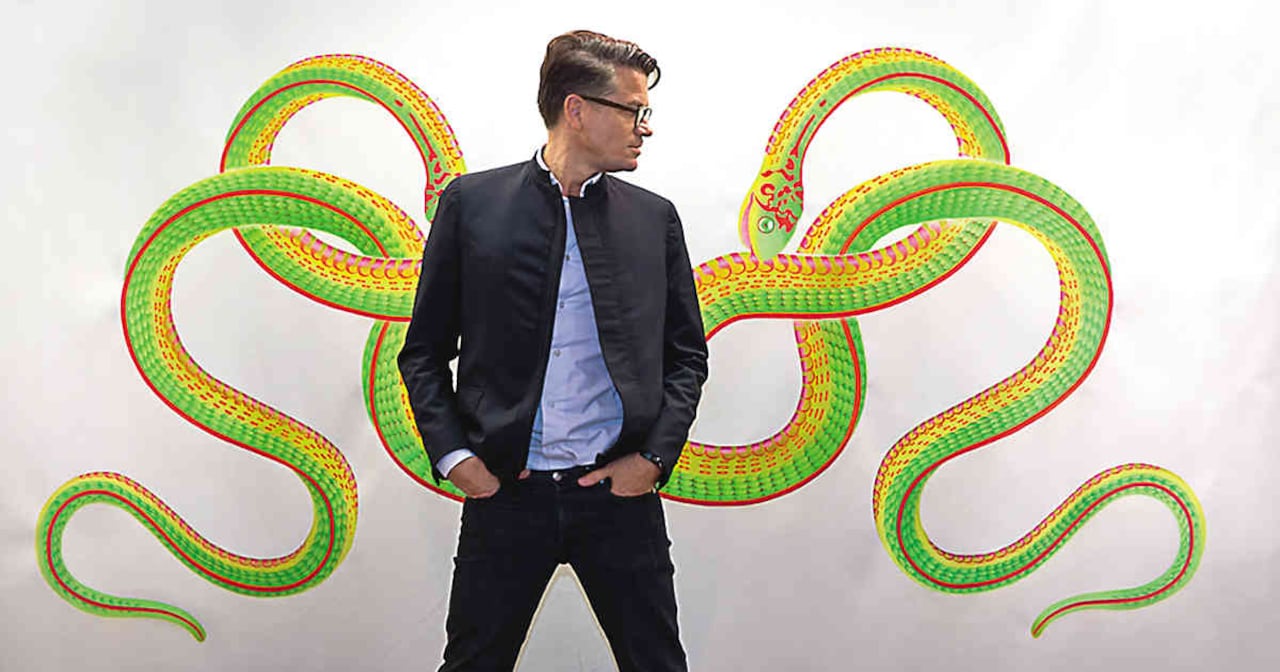 Además de esta serie marina, en la semana del arte de Bogotá trajo su obra de serpientes Royal Gala, a la que describe como un ritual de paso: la inició en 2009 y la finalizó en 2016, pues la tuvo en pausa durante su paso por Céline. Tal vez era un alto en el camino en su estructura interna, un salto del blanco y negro al color, una búsqueda de equilibrio entre lo masculino y femenino de su ser, pues para él la serpiente simboliza el lado izquierdo y el derecho del cerebro, ese diálogo –bipolar, si se quiere– que todos tenemos, pero pocos reconocemos.