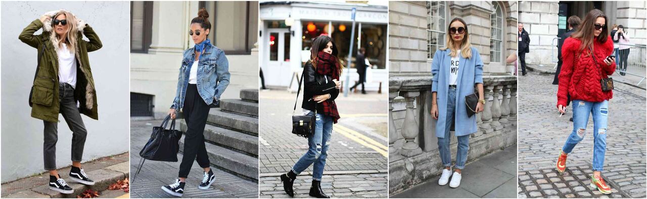 Los tenis también son grandes aliados por su comodidad siempre y cuando no sean de tela o suela delgada (por aquello de la humedad). Los de bota alta funcionan bastante bien combinados con skinny jeans y bomber jackets o con sacos o camisetas oversize.