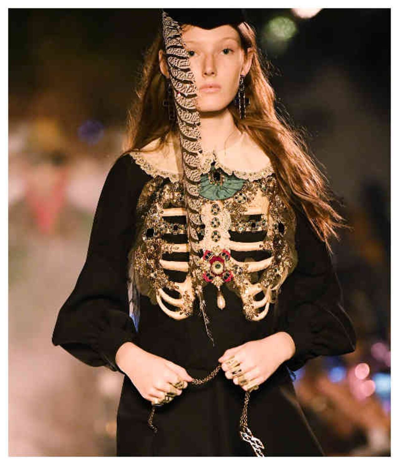 El resultado fue el de una pasarela inquietantemente embrujada, con un cementerio prendido en llamas como telón de fondo perfecto para una propuesta donde los excesos y los estilismos imposibles de carácter vintage fueron los protagonistas, llena de crucifijos y vestidos victorianos, completamente Guccificada.