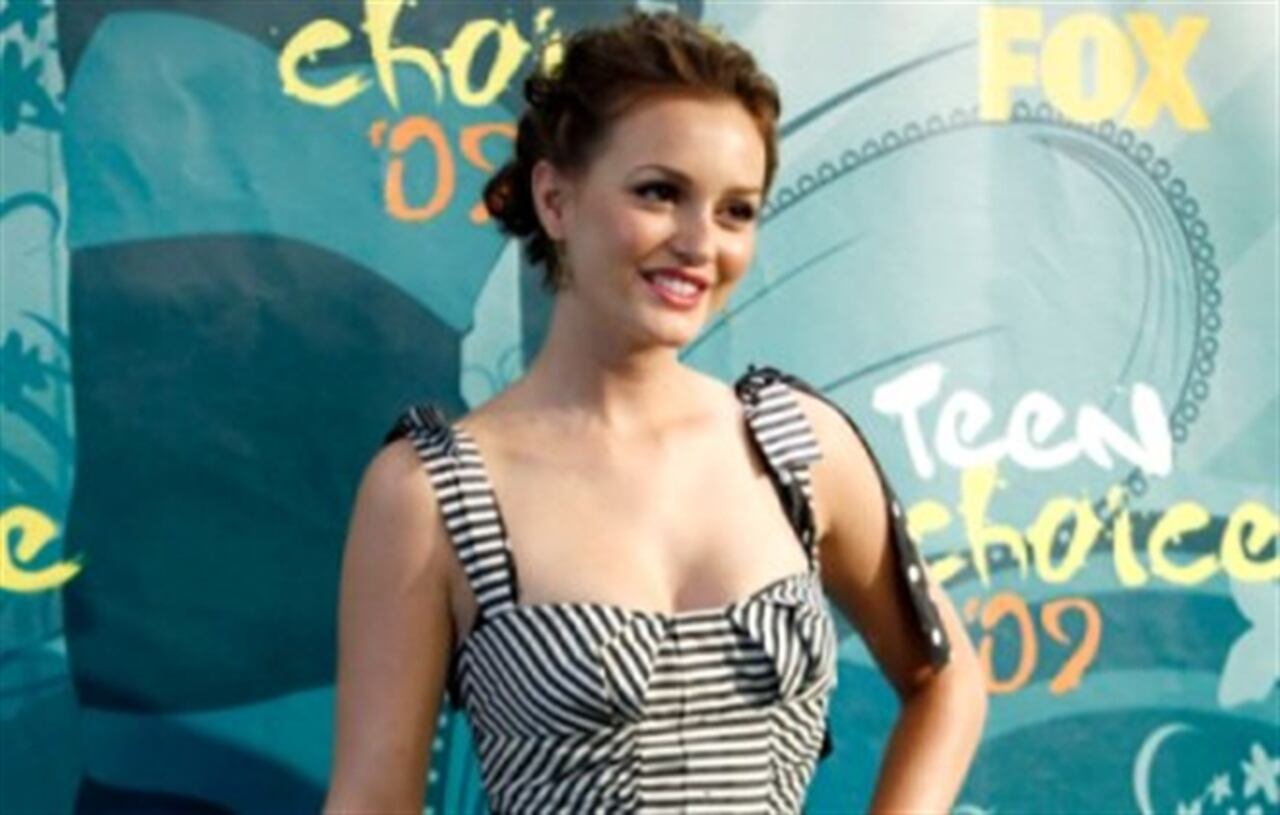 Leighton Meester, la estrella de “Gossip Girl”, lució un vestido corto de rallas blancas con negro de Louis Vuitton, acompañado con unos impactantes zapatos de tacón rojos.