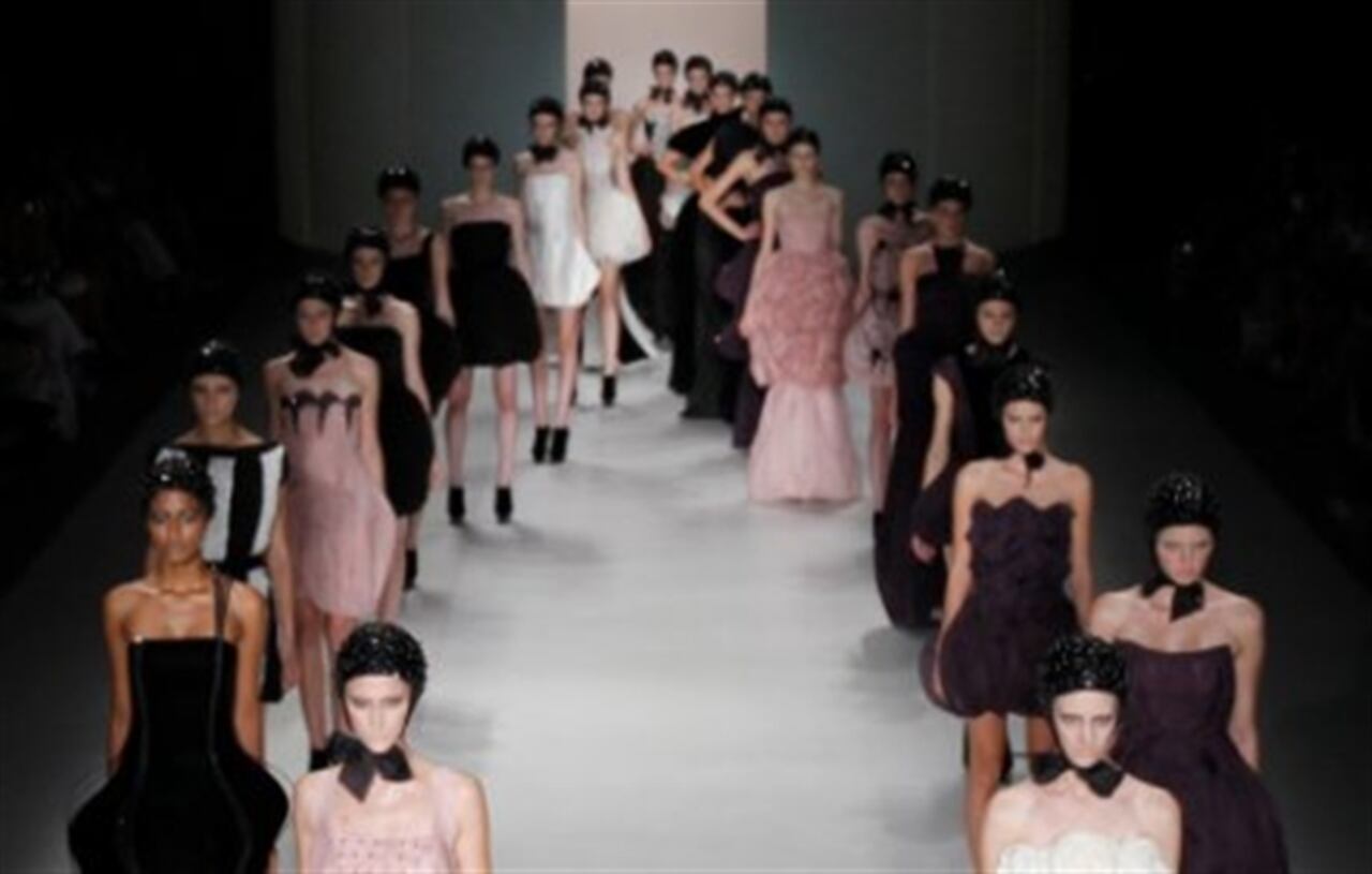 Acquastudio: la colección estuvo inspirada en la obra del joyero y vidriero francés Rene Lalique. Durante el desfile se vieron vestidos con cortes redondos y ovalados, acentuando la cadera en tonos rosados, blancos y negros.
