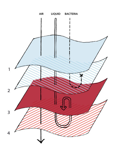 La capa 1 te mantiene seca. La capa 2 combate las bacterias. La capa 3 es absorbente y la capa 4 contiene filtraciones.